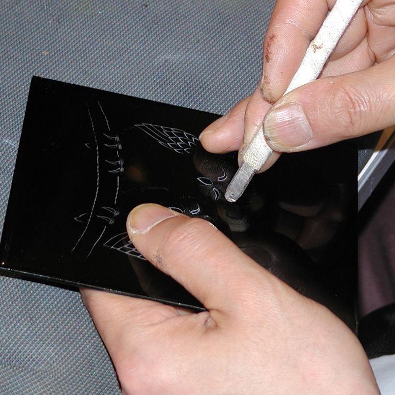 沈金とは、線や点や面を彫った後、その溝に漆を施し、漆が乾燥しないうちに金箔や金粉、銀粉、色粉を埋め、接着させる方法で文様を表現します。